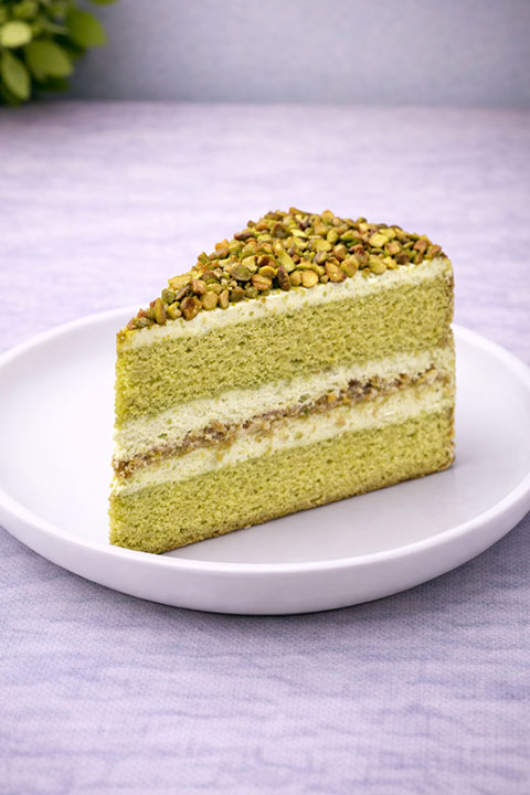 Rich pistachio cake layered with creamy filling and nutty praline for a luxurious dessert experience.