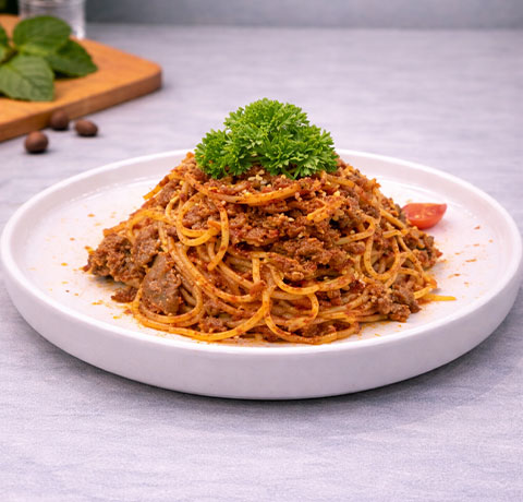 Rich beef Bolognese sauce served over perfectly cooked spaghetti.